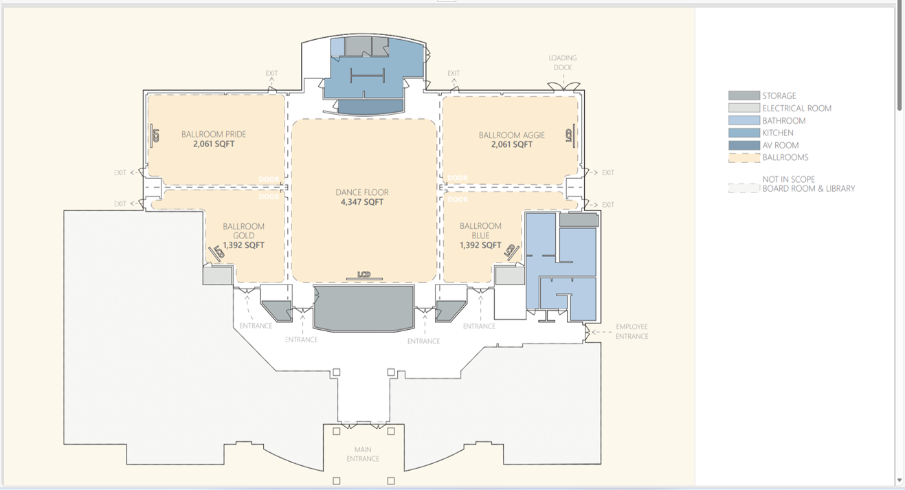 The Aggie 101 or Pride 103 is a 2,061-square-foot event space that can accommodate 70 to 200 guests. This configuration can also entertain up to 200 guests for a free-flow reception.